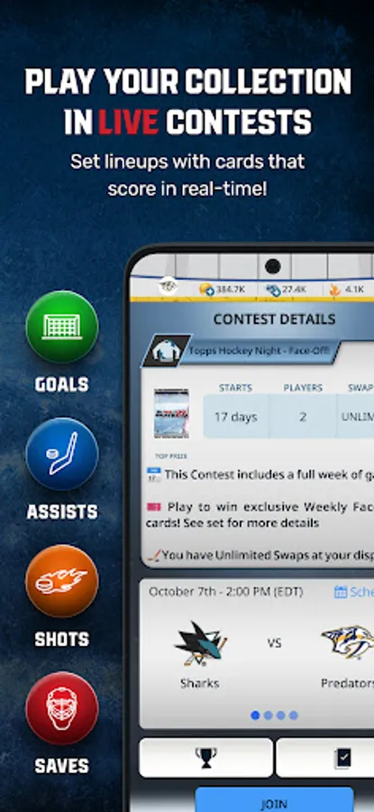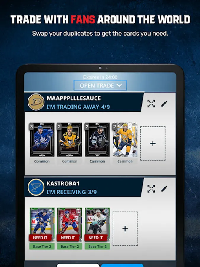 Topps® NHL SKATE™ Card Trader is the official digital trading card app of the NHL, NHLPA, NHLAA! Join a passionate community of hockey fans from around the world that enjoy collecting and trading Topps NHL cards and bringing their collections to life with fun, interactive in-app features! Unlock a world where you can celebrate the NHL players and iconic moments you love with the convenience of ripping packs from your mobile device! Set lineups using Topps NHL cards in your collection that score every goal, save, shot, assist – all in real-time! Collect your favorite players and teams showcased through classic Topps card designs, original artwork, player autographs, relics, and more!