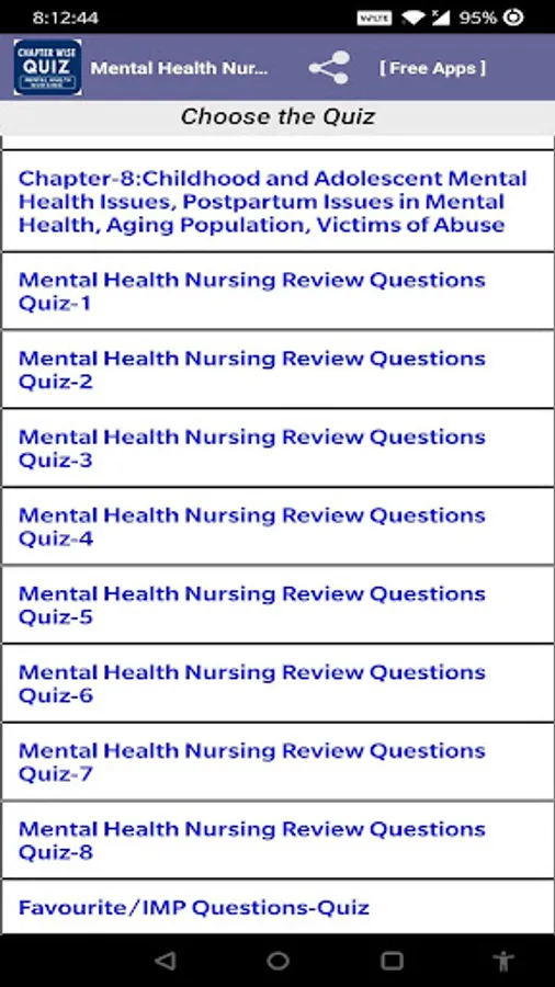 Mental Health Nursing Chapter Wise Quiz Free App chapter wise questions help to prepare Mental Health Nursing Exam. In this Mental Health Nursing Chapter Wise Quiz Free App student can practice selected chapter with that chapter questions.