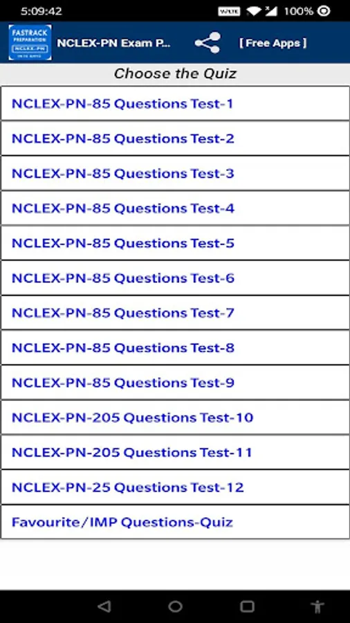 NCLEX-PN Exam Prep in 15 Days Free App having total 1200 questions will help to prepare NCLEX-PN Exam. In this NCLEX-PN Exam Prep Free App students can practice 85 or 205 questions. In every quiz student will practice different questions.