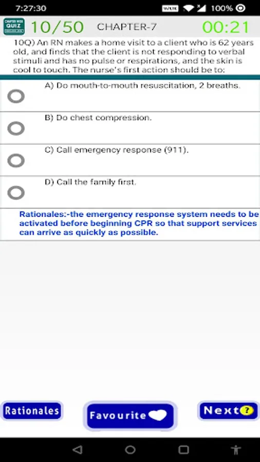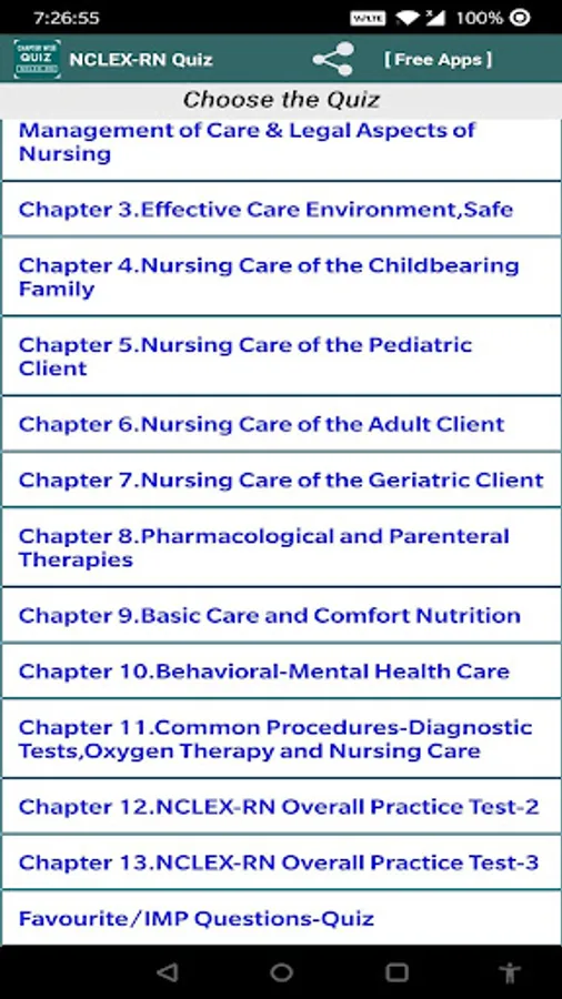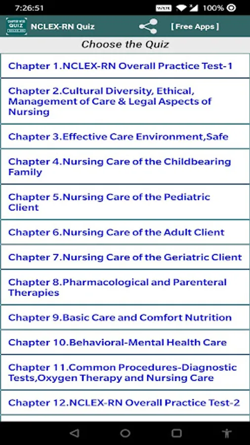 NCLEX-RN Exam Prep Free App chapter wise questions help to prepare NCLEX-RN Exam. In this NCLEX-RN Exam Prep Free App student can practice selected chapter with that chapter questions.