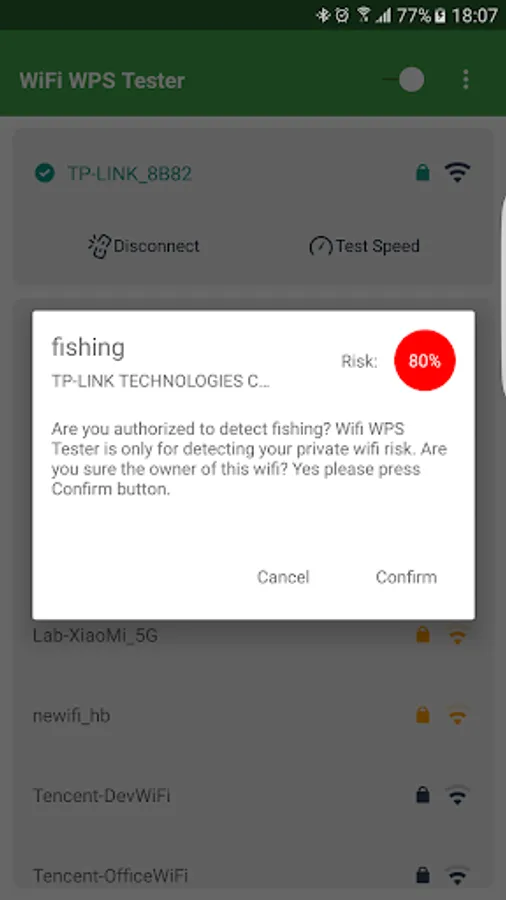 WiFi WPS Tester is a utility which helps you detect the potential risk of the WiFi, which include password risk and WPS risk. Shipped with more than 30 PIN algorithms and 50000 known PINs, WiFi WPS Tester helps you detect the potential WPS risk. And with millions of hotspots, WiFi WPS Tester may find the possible Password risk. We don't store your original key, neither do we share with other users. But if your WPS WiFi can be connected without manual inputs, it is suggesting that you should change the key to a more complicated one or turn off WPS.