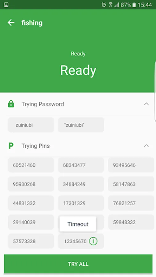 2. In detail page, we can click on 'TRY ALL' button to try all untested pin and password. Be patient, it may cost a few minutes.