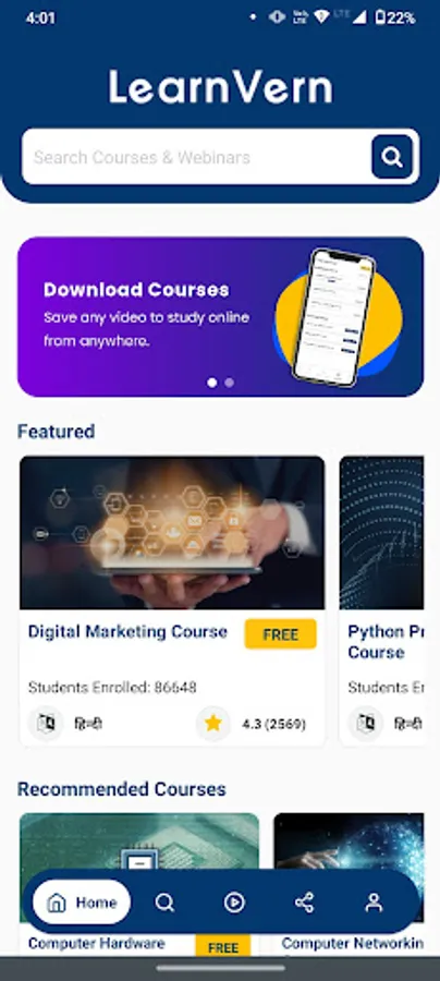 LearnVern app allows students to learn 75+ Courses for free all taught in Hindi and other Indian languages like English, Bangla, Tamil, Telugu, Gujarati, Marathi. Free Course Tutorials are taught by expert trainers of Computer Science, Mechanical, Civil, Business, Graphic Design, Spoken English with Government Certificate.