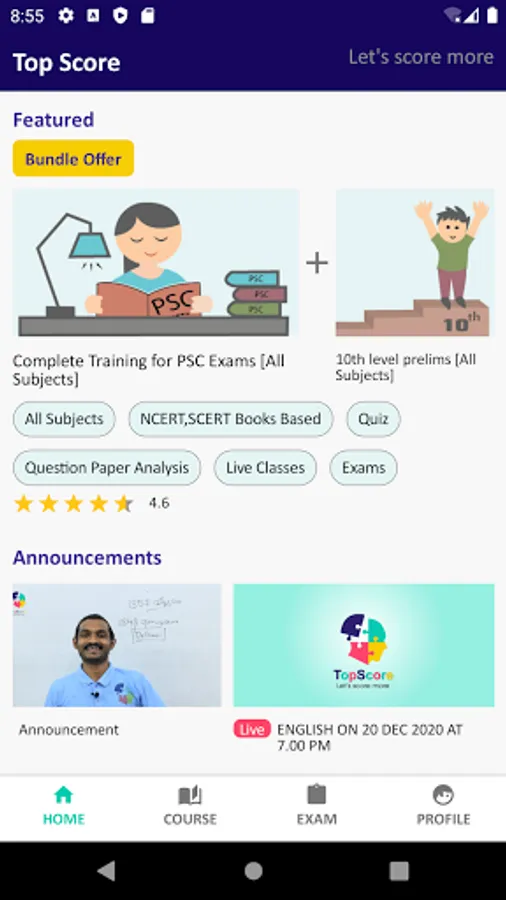 Finding an apt training platform is not an easy task as far as the exams conducted by Kerala Public Service Commission is concerned. A wrong decision on” where to switch on” may lead an aspirant’s career to total uncertainty. This app comes with a perfect solution to all challenges the aspirants face in their journey to success. With the aid of a highly placed faculty powered by unique study materials, the team TopScore is pledged to clean up all obstacles on your way to success. The ultimate objective of this career guidance platform stands to be the uplift of each user to the achievement of a government job desirable to their academic qualification. TopScore ensures the above said objective with its comprehensive class room, renowned faculty, long mock test series, quizzes, lucid and precise notes....and so on.