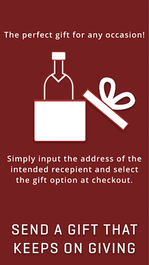 - Gifting: easily send alcohol as a gift to your client, significant other, family member, boss, or buddy you lost that bet to, simply select the gift option and add the gift recipient’s information at checkout.