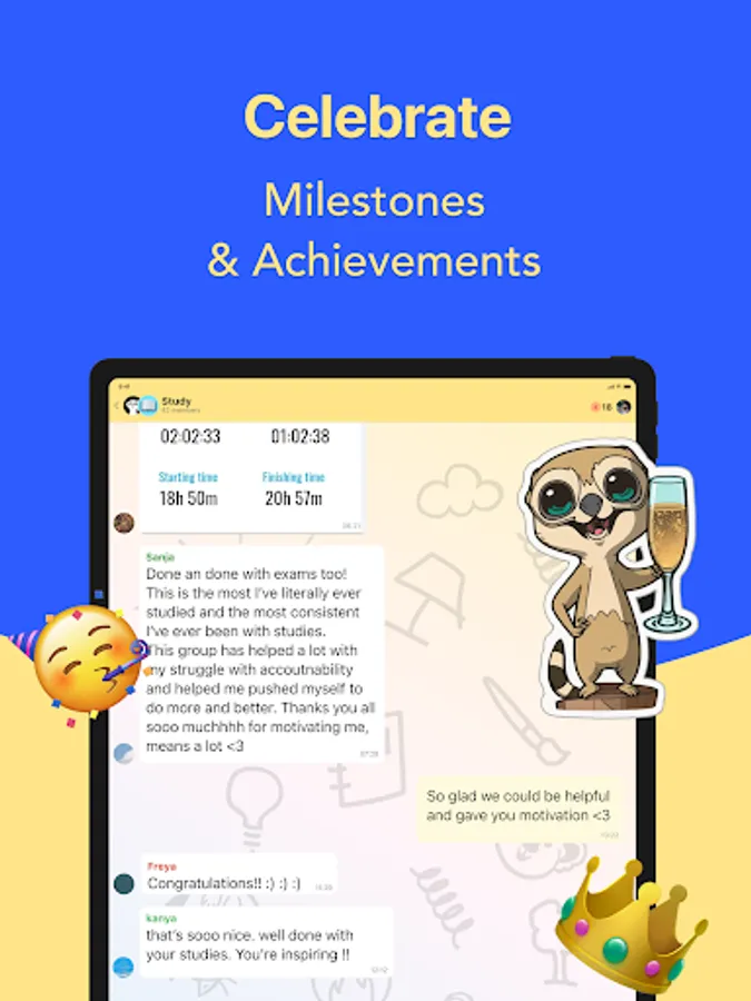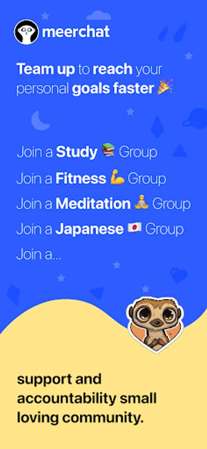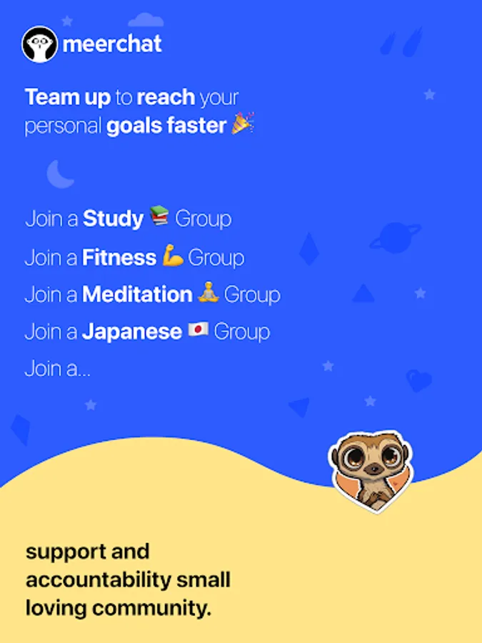 Discover the magic of an always-on, super-supportive community with Meerchat! Connect with a small group chat of peers who are all about supporting, motivating, and cheering each other on in their personal goal adventures. Meerchat links you with like-minded buddies in cozy group chats.