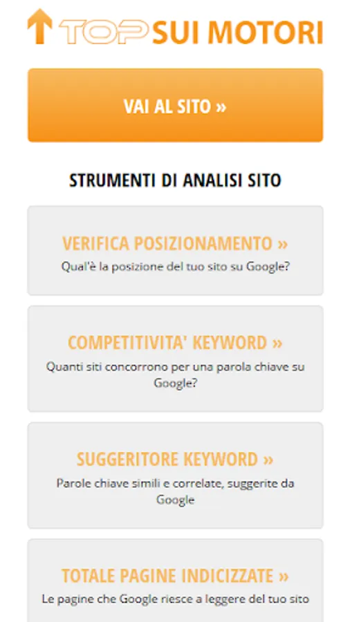 The official app of Topsuimotori offers analysis tools SEO (search engine positioning) to monitor the health of your site. It allows: