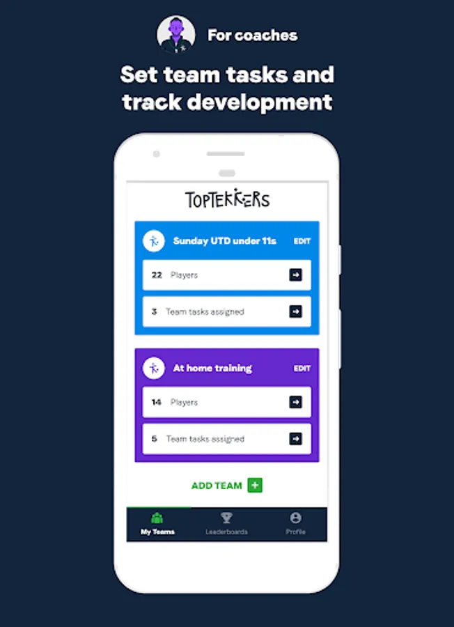 Coaches can set Individual Learning Plans as well as Team Learning Plans, monitor the progress of their players, and identify areas for improvement. Different difficulty levels can be set for different players, ensuring a personal experience for each child using TopTekkers.
