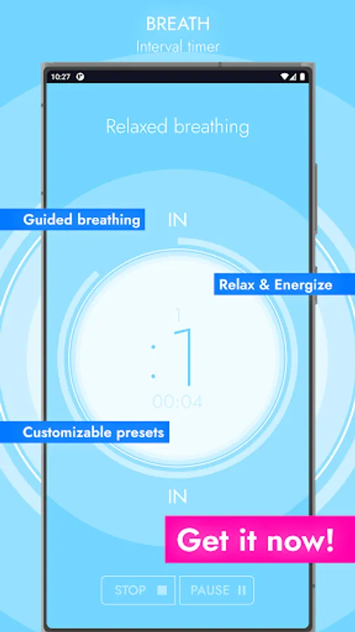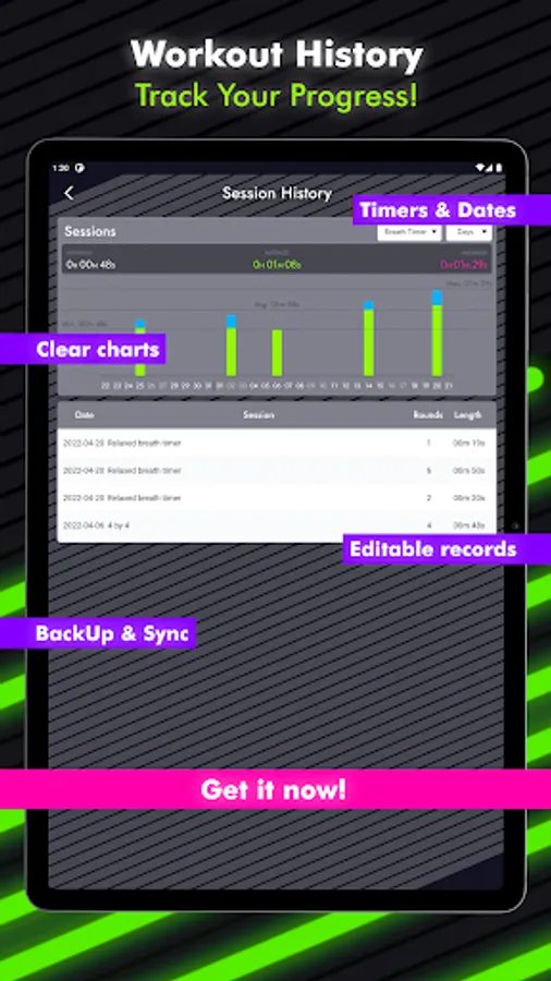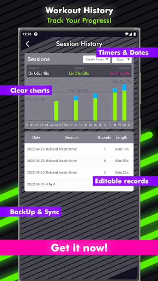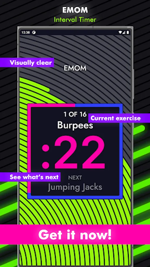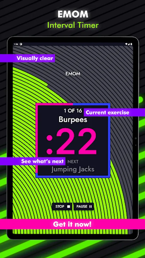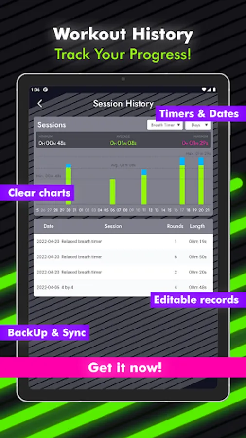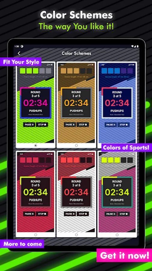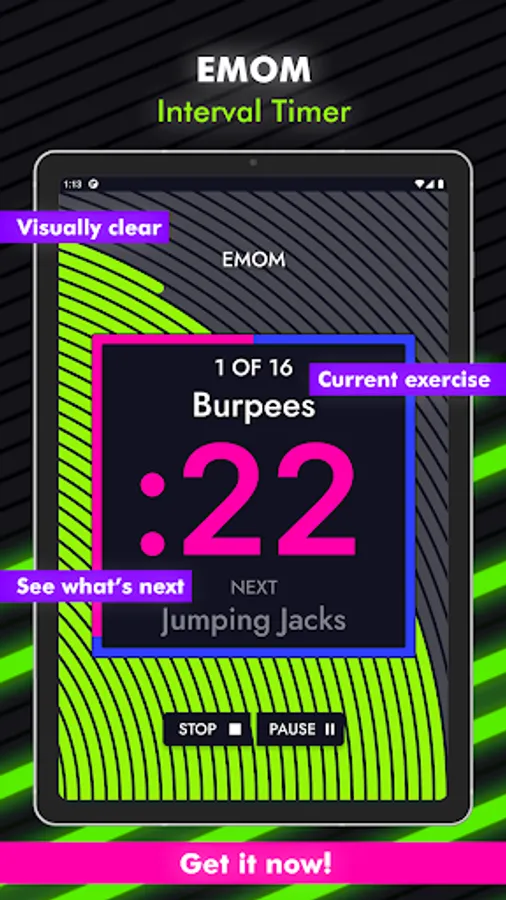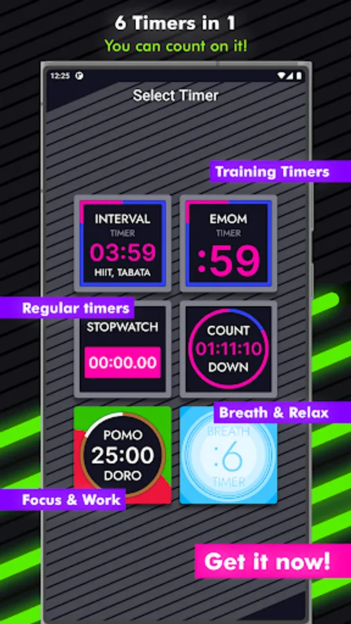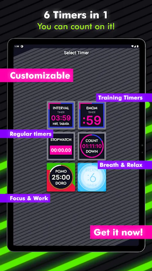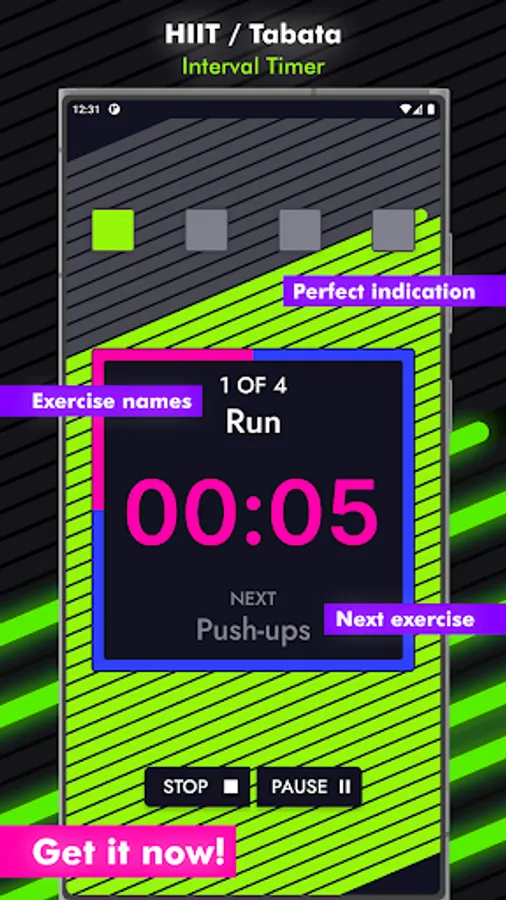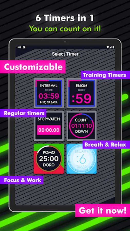 Top Timer contains 6 timers for most of your needs: workout, HIIT (Tabata), EMOM, Breath, Pomo doro, Countdown and Stopwatch. Clear visual and auditory indications of work and rest rounds, customizable timer presets with workout exercise names, workout history, color schemes and sounds.
