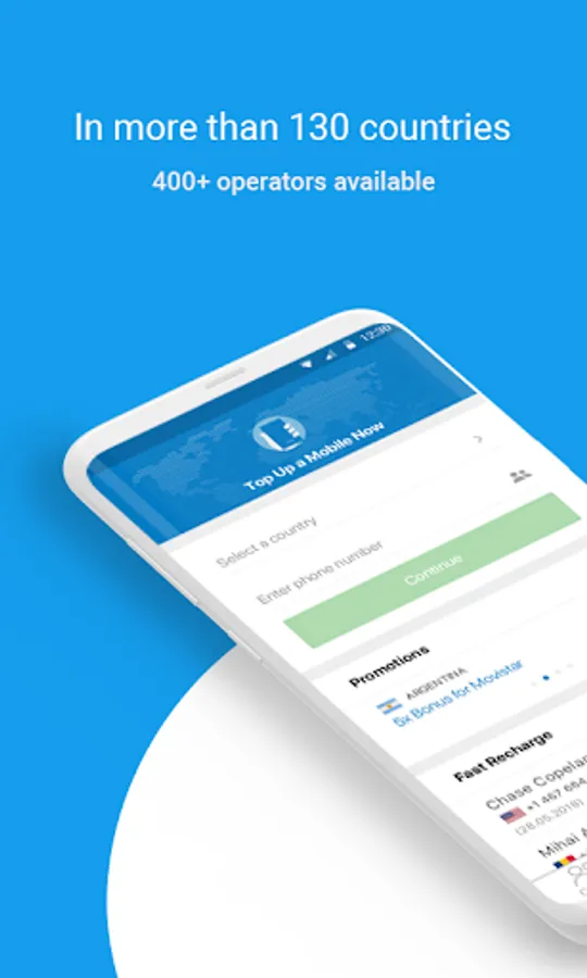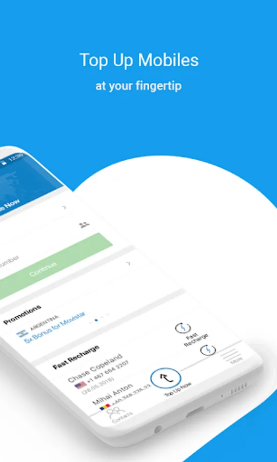 Top up mobiles everywhere in the world using TopUp.com app. Itโs your fast & reliable airtime service. Take advantage of our daily mobile top ups offers and get 100% satisfaction for all orders. Send credit or add minutes to any prepaid number in just a few clicks!