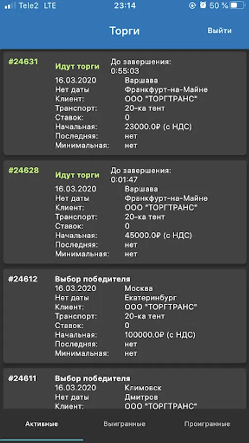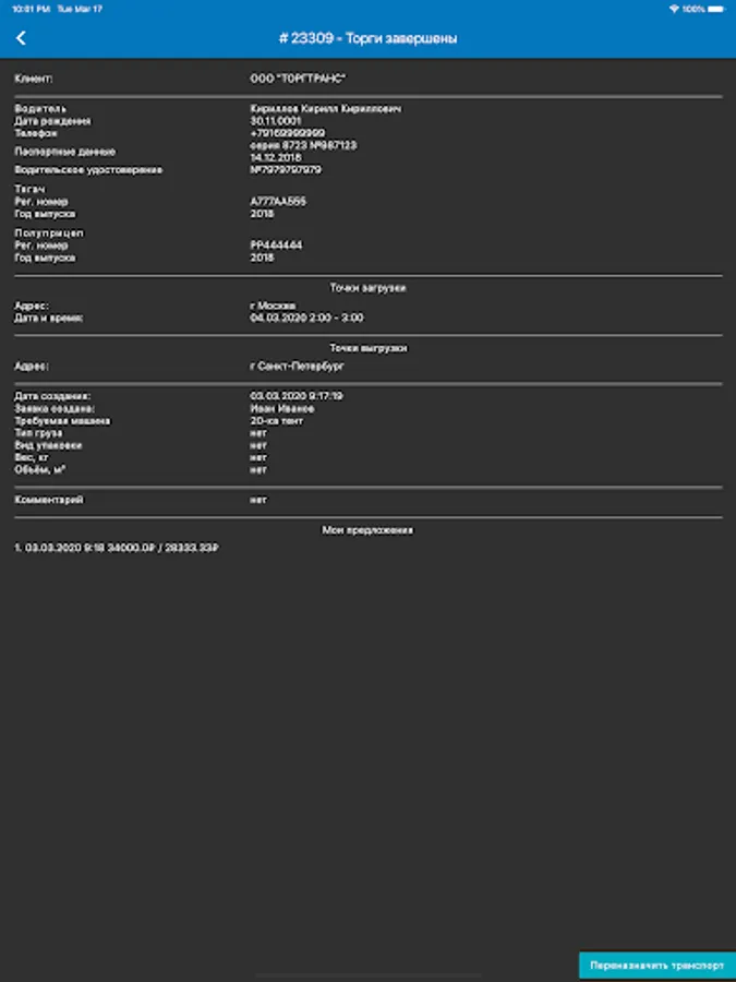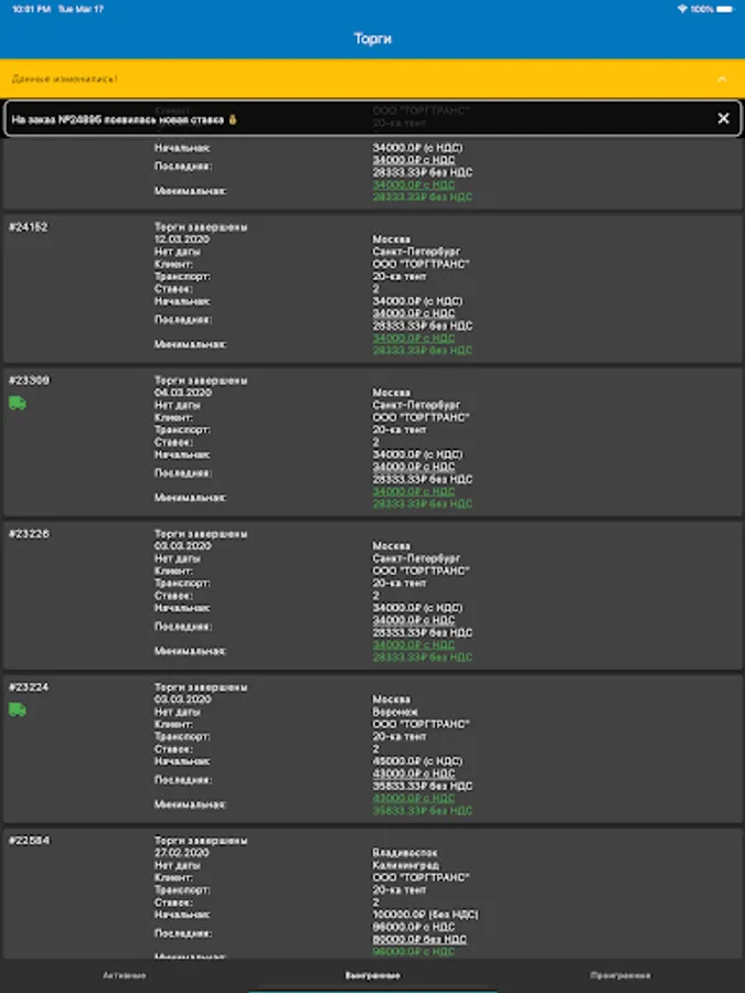 Torgtrans is a mobile application for carriers registered in the Torgtrans service. In the application it is possible: to receive notifications of new orders, to offer prices for flights placed, to confirm the availability of cars at the prices of price lists, to appoint vehicles and drivers for flights. Torgtrans is a service for finding partners (carriers and shippers) in transport logistics and automation of work with them.