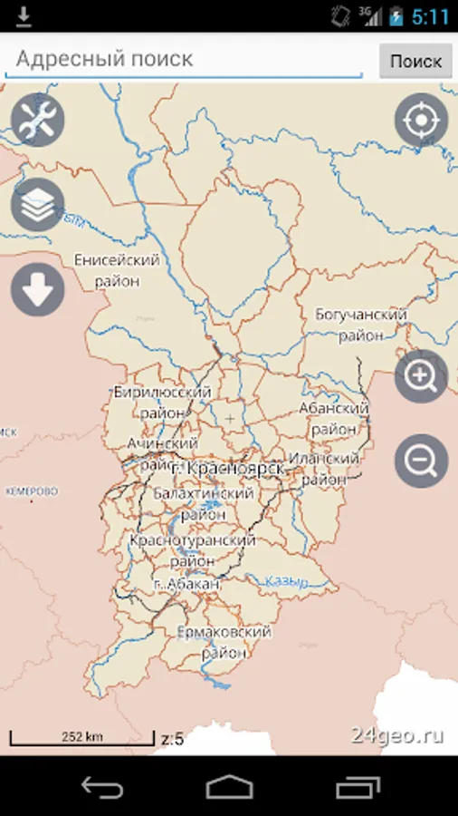 Map of Krasnoyarsk Territory is available for Android, iOS and Windows. Permanent links to applications and enhanced information, see https://24geo.ru.