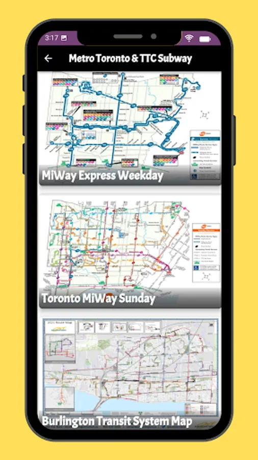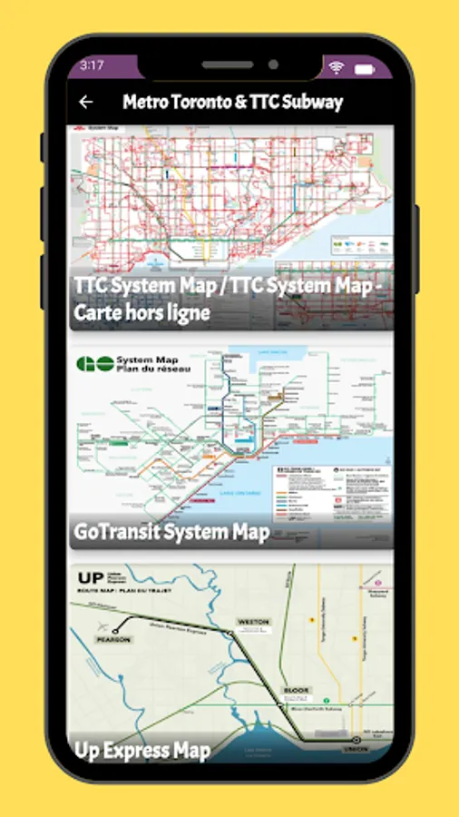 Includes a complete set of maps for the Toronto, bus, metro, rail, rail, tram – basically all transit types – from the official sources.
