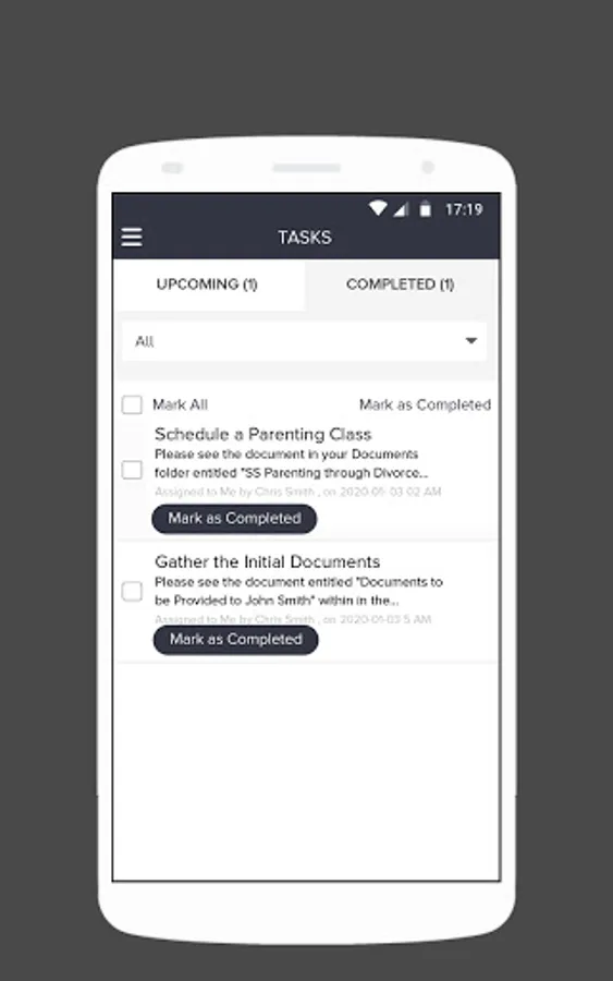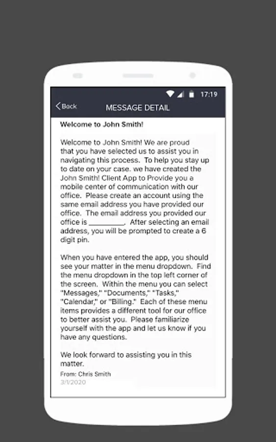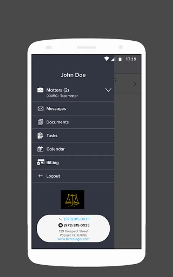 The Torres Legal is for clients of the law firm Torres Legal. The App is intended to assist clients in communicating with their attorney and staying informed regarding their case. Clients may utilize a message feature to send and receive messages with their attorney, as well as upload and view documents, receive assigned tasks from their attorney, view their case calendar, and stay up to date on their bill. The Torres Legal is intended to supplement traditional means of communication and insure the clients of Torres Legal are thoroughly informed.