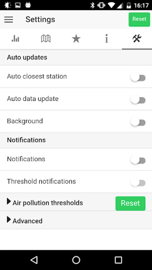 - Optionally, run in background (to update air quality location data and / or closest air quality location based on your location).
