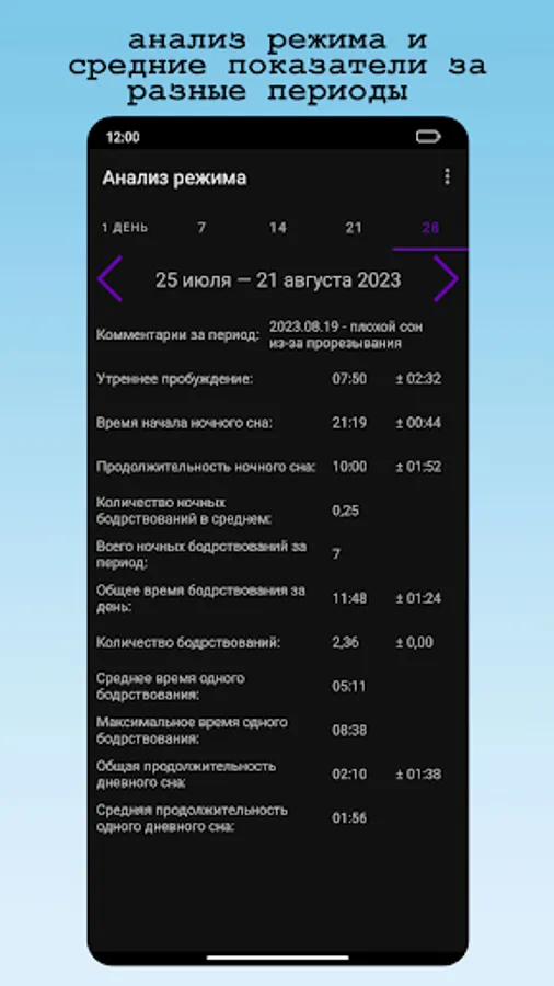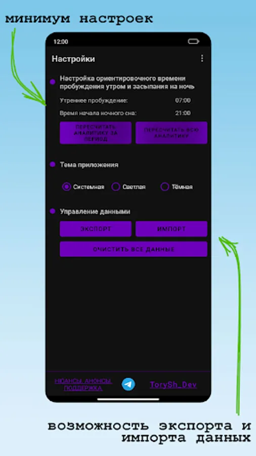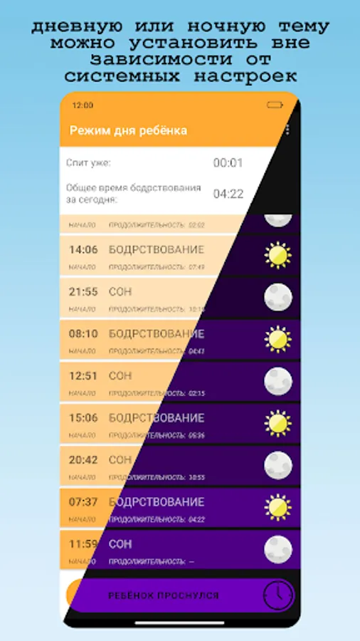 - There is support for day and night theme of the application. You can set the theme regardless of the theme of the device. When changing the estimated times of awakening and falling asleep for the night, analytics can only be recalculated for a given period. So the analyst will not go astray for the old days, when the child had a different daily routine.