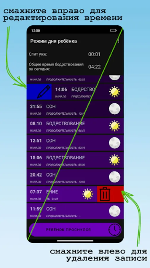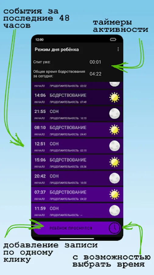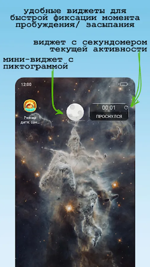 - In one touch, fix the new wakefulness or sleep of the child. And convenient widgets will allow you to do this without going into the application.