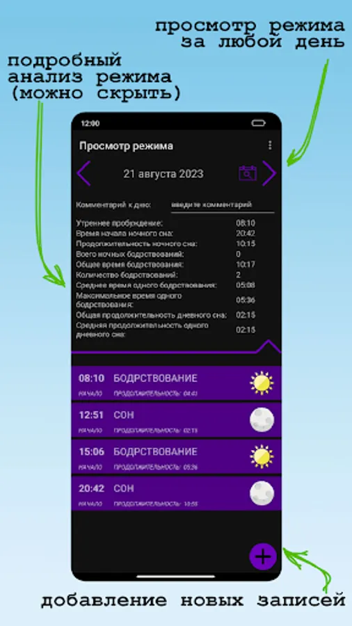 - On the widget and the main screen of the application, you can track the duration of the current activity and the total daily wakefulness in order to prevent accidental overindulgence.