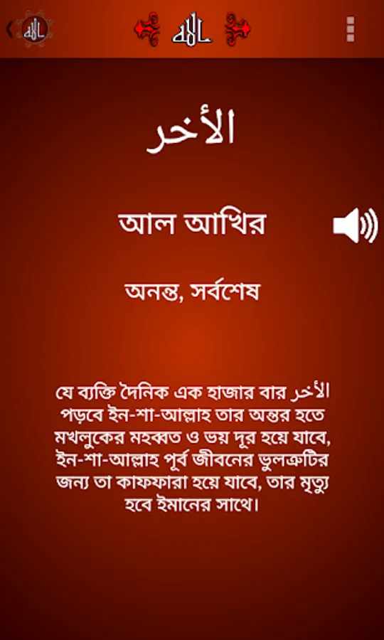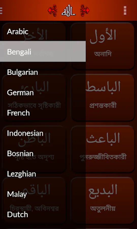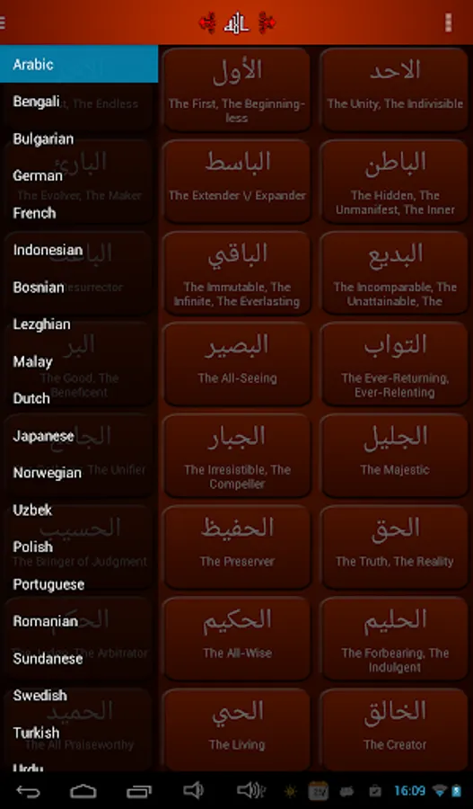 Name of Allah with audio,meaning, transliteration,profit in 21 languages.
