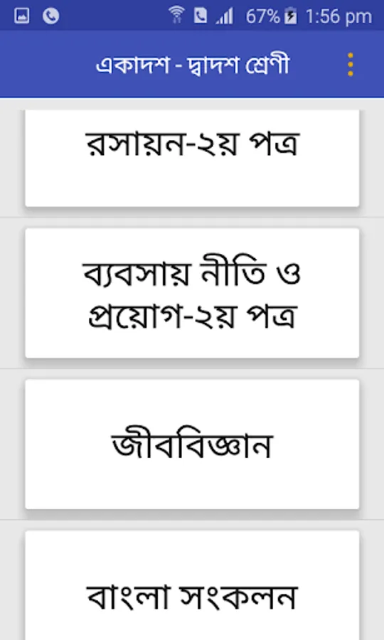 Our app contains Bangla, English, Mathematics, Sociology, Science, Fine Arts, ICT, Physical Studies, etc for class 6, class 7, and class 8. For secondary classes ie- classes 9 and 10, the app has Physics, Chemistry, Higher Mathematics, Biology, etc, and other subjects.