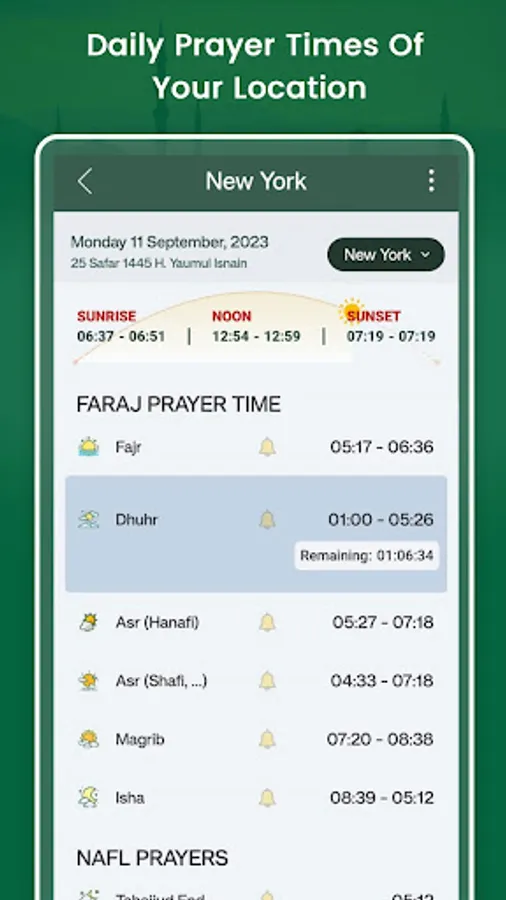 • Prayer Time / Salat Time Prayers: Fajr, Dhuhr, Asar (Hanafi & Shafii, Maliki, Hanbali), Magrib, Isha, Tahajjud, Sahri, Iftar, Jawwal, Awwabin / Awwabean, Sunrise, Noon, Sunset