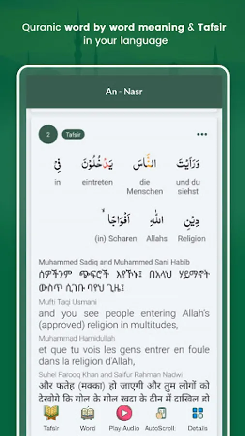 • Quran section provides 70+ Translations with 20+ Tafsirs