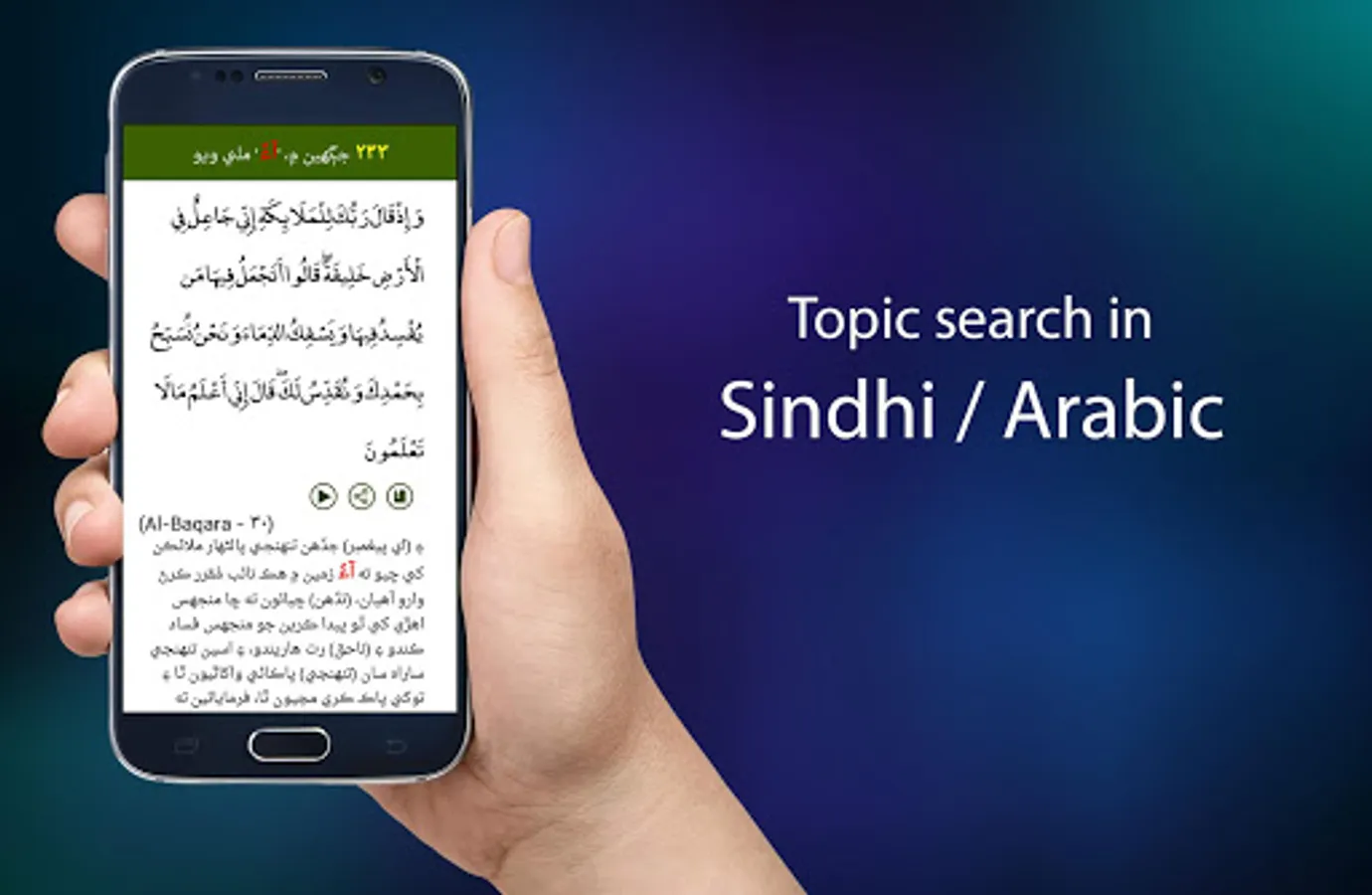 With this Islamic book app, you are getting Hafizi quran with real page-curl experience. This is not just a textual app, it is an audio Quran app. You can listen telwat of Quran ayats continuously (internet connection required). You can search words or topic in Sindhi on this Android Quran app. Bookmark the ayat / verse you like / quote. Share the ayat / verse you want.