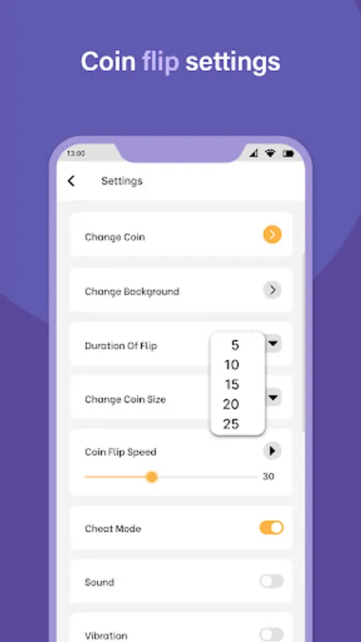 You can set the duration of flips from 5, 10, and 15 times, change coin size in percentage, and also can change the coin flip timing.