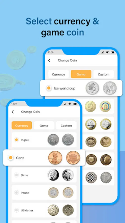 Coin Flip Toss for Head/Tail application gives different currency coins, game coins, and also you can create custom coins to toss heads or tails.