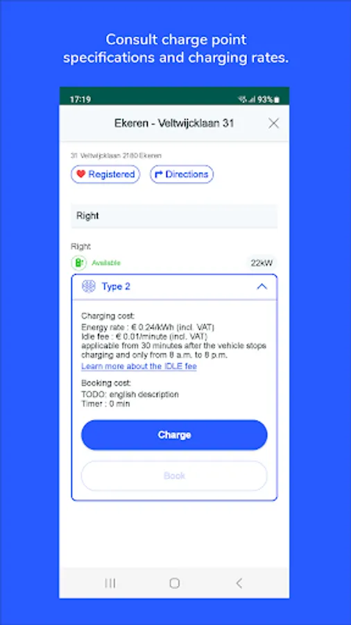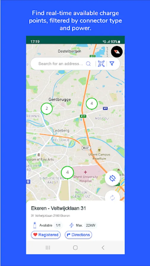 - Find real-time available charge points, directly on the map or through a search box, filtered by connector type and power.