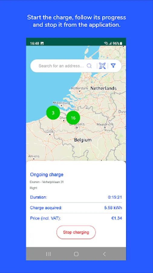 - Monitor your ongoing charging session in real-time and stop it with a single click.