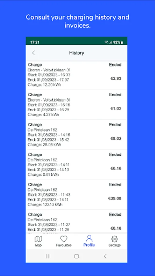- Create an account and save your mean of payment, get easy access to your charging history and invoices, and set as favorite your preferred charge points for future easy access.
