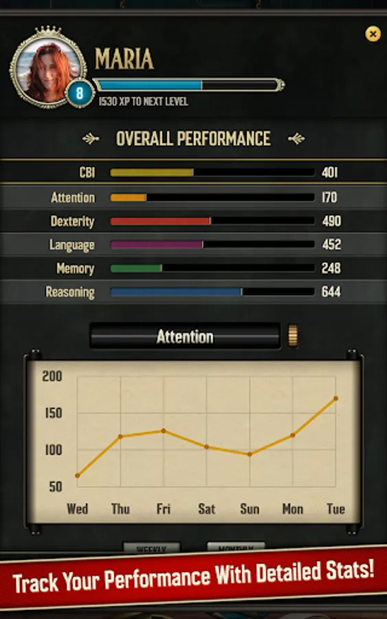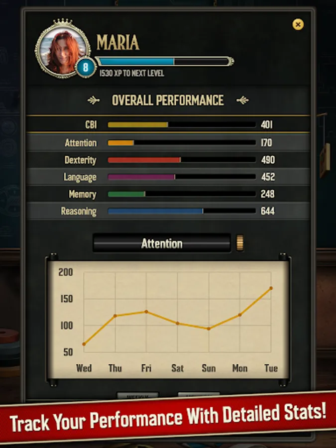 • View weekly and monthly graphs and in-depth statistics of your performance in Memory, Attention, Dexterity, Language and Reasoning games!