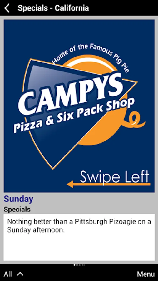 Campys Pizza & Six Pack Shop, with locations in Charleroi and California, Pennsylvania, offers some of the most delicious pizza and unique craft beers in the area. With App offers added to their coupons and specials you will enjoy delicious food and drink, amenities like fingertip phone in for carry-out or delivery orders, and a staff ready to cater to your office or special occasion needs. Great pizza, wine and beer, friendly service and now a convenient, money-saving App from Campys Pizza & Six Pack Shop.