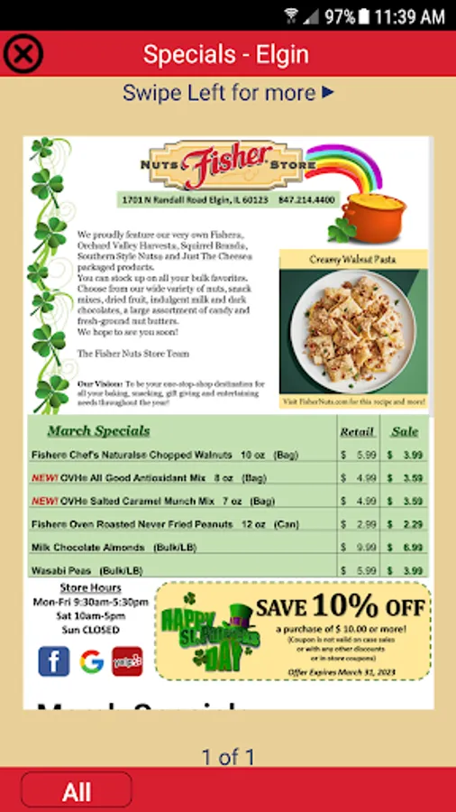 The App is FREE, offers are paperless, specials are super – sort of like an outlet at your fingertips – from your friends at Fisher Nuts Store in Elgin.