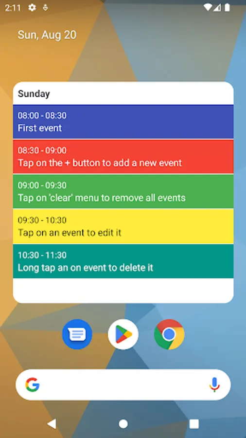 Chrono Table is a simple to use, intuitive application for managing your school, business, work or any other weekly activities. The application is designed to be easy to use and is not bloated with lots of fields that must be filled. You simply need to fill in the event name, select a time range and save. After that, you can simply swipe left and right to see what's coming up in your schedule. You can use the app as a class timetable and is the perfect companion for school, college or university. No other timetable app has ever been this easy to use. This application does not require creating an account or Internet connection, it is completely offline.