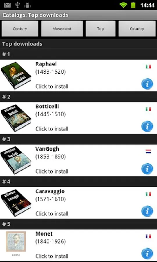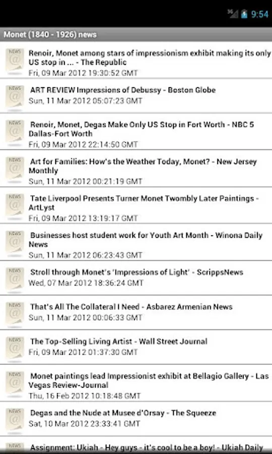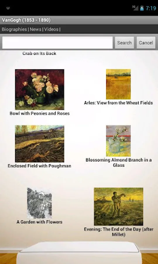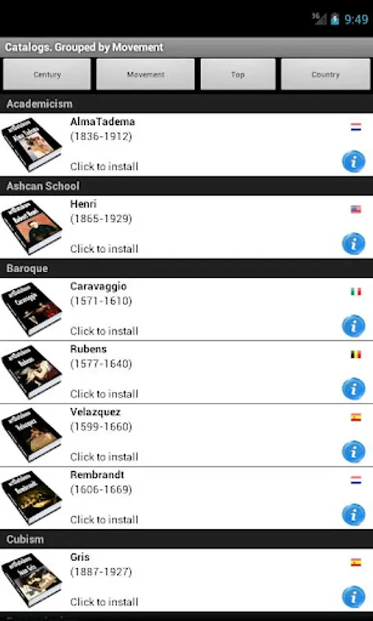 For each artist, you will find a complete list of their artwork and images, the whole collection becomes a virtual art museum with additional information such as when each work was created, the medium it was produced on and where it is now. Supplemented by extra information: biographies, news and little known facts about the artist.