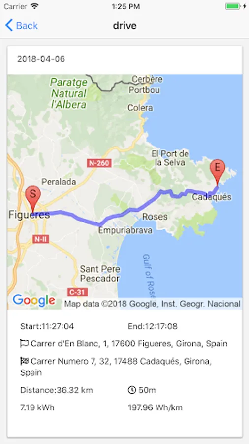 - speed map for every trip, with segment lines according to speed (colour and stroke weight): you can see at a glance the velocity of your car for every segment