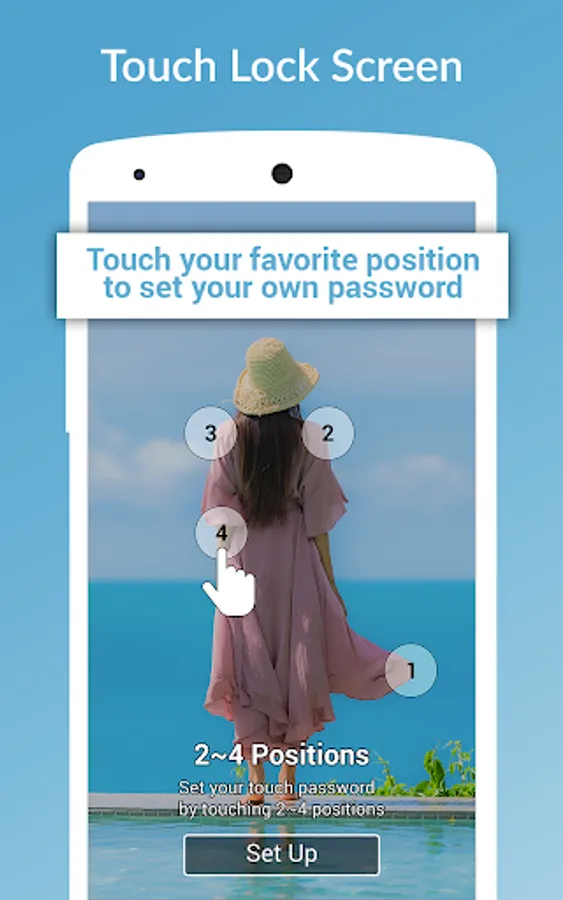 Touch lock screen - touch photo position password is very essential application because nowadays mobile security is the main priority of every person. if you don’t set your mobile screen password or screen lock then anyone can see your private messages, your private information, contact details, photos, etc. The touch lock screen is an advanced mobile screen lock technology user can select their particular touch position to lock mobile phones. You can set two to four touch positions for the lock screen. Only, you must have to remember the set touch position, You can set a recovery password (Pin Password) for in case you don’t remember the touch lock screen password.