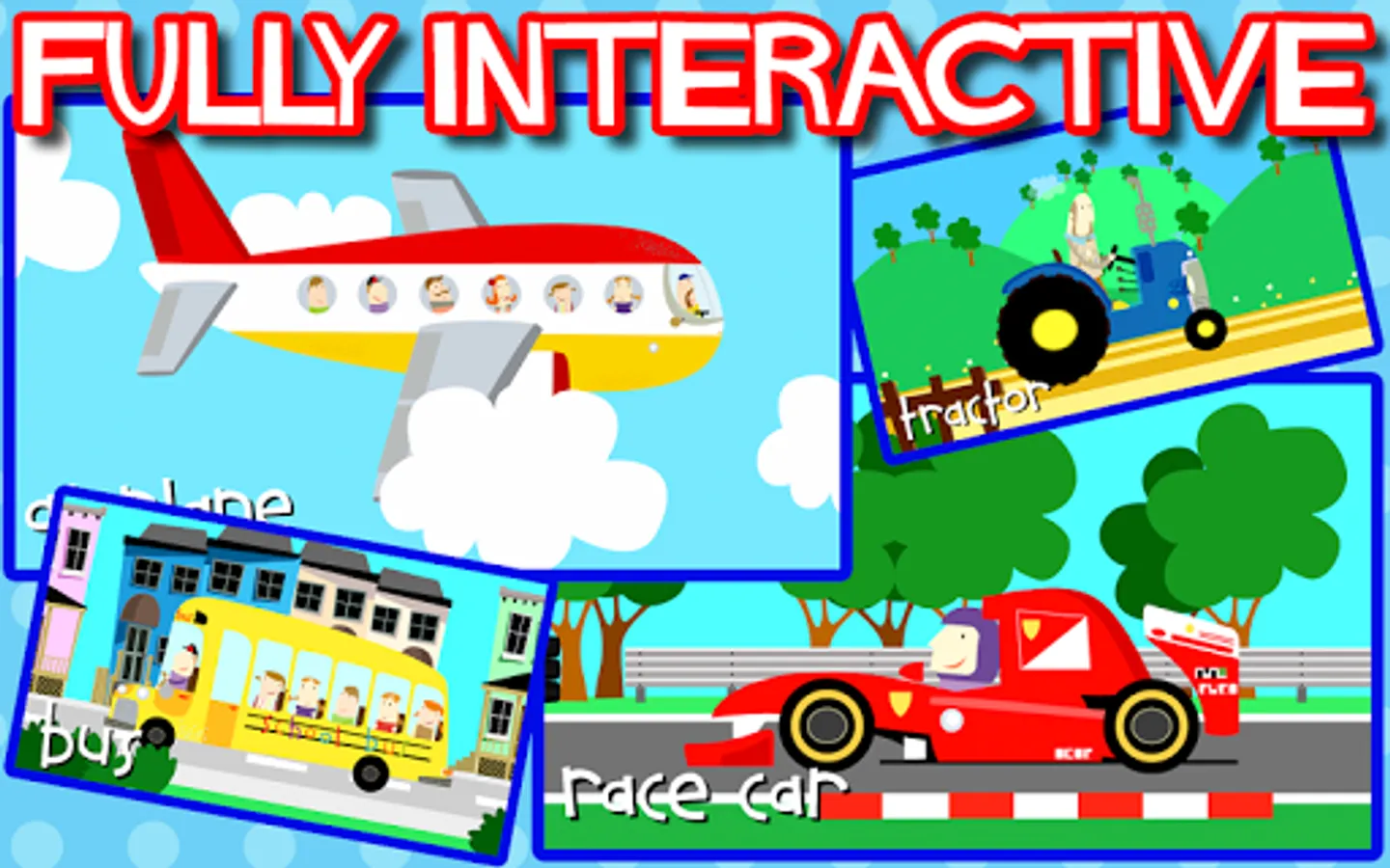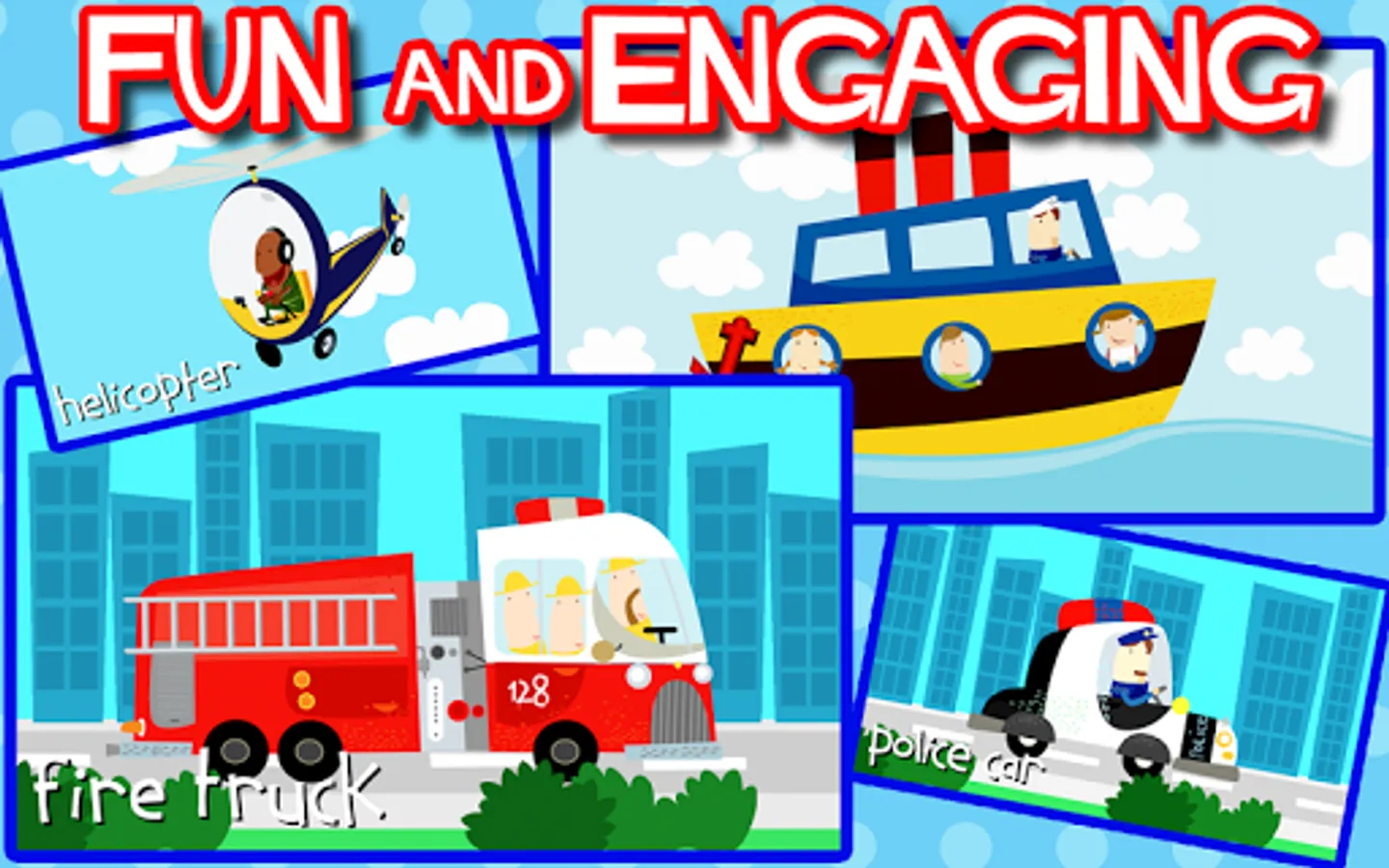 ★ Discover exciting CARS, FIRE TRUCK, RACE CAR, HELICOPTER, ROCKET, TRACTOR, AIRPLANE, TRAIN, SHIP, MOTORCYCLE, AMBULANCE and BUS... ★