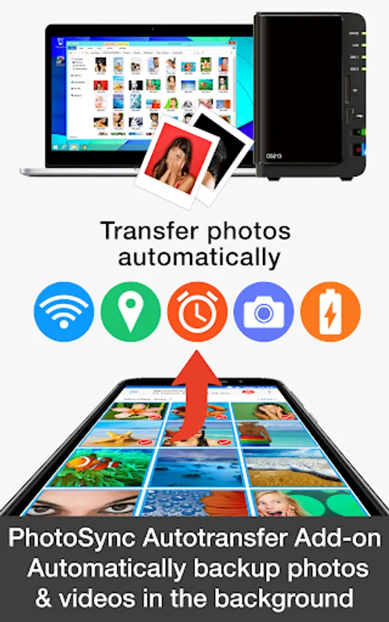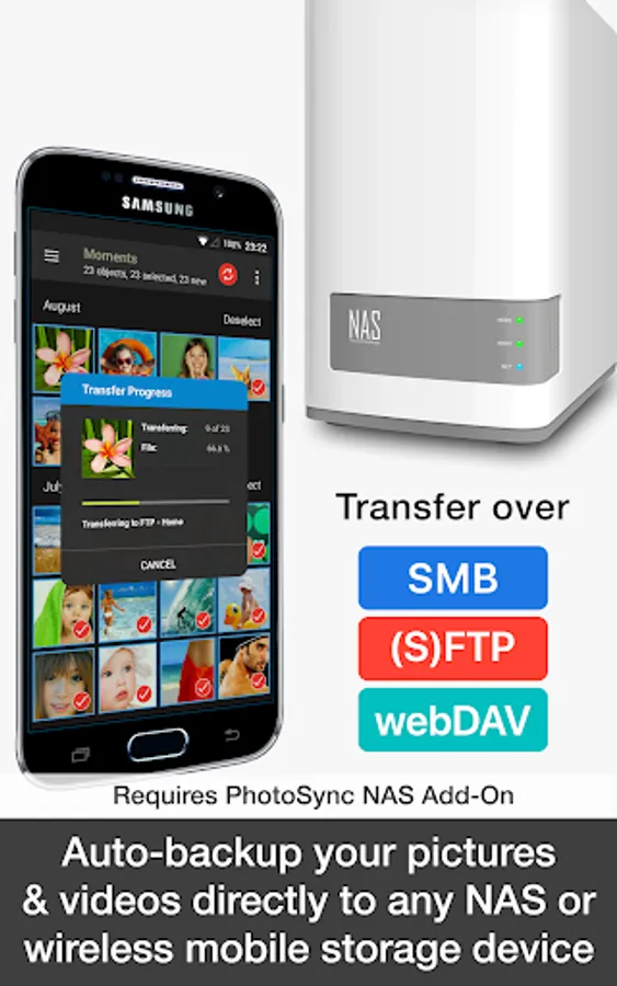 • Safely auto upload your photos and videos straight from Android to any NAS, wireless mobile storage device or remote server over SMB, (S)FTP or WebDav. (Requires PhotoSync NAS Add-On – all major NAS and mobile storage devices are supported!)