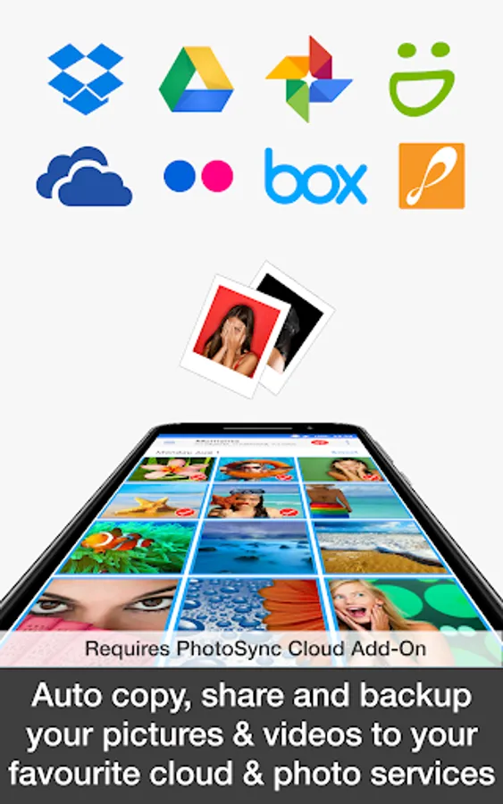 • Securely auto copy, share and backup your photos and videos directly from your Android phone / tablet to your favourite cloud and photo services over WiFi and Cellular network. (Requires PhotoSync Cloud Add-On – Dropbox, Google Drive, Google Photos, Flickr, OneDrive, SmugMug, Box, Zenfolio and PhotoPrism are supported!)