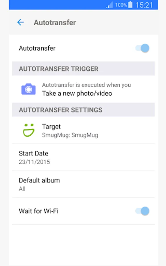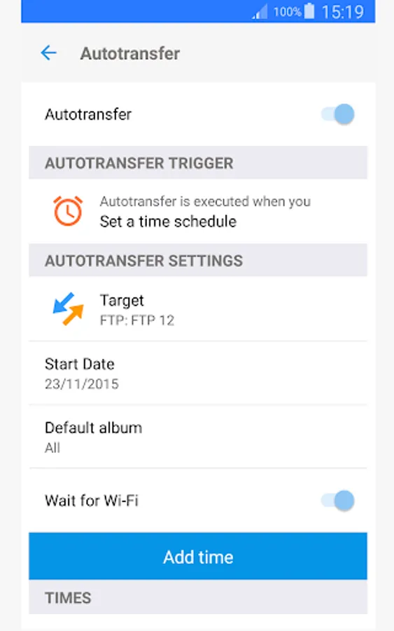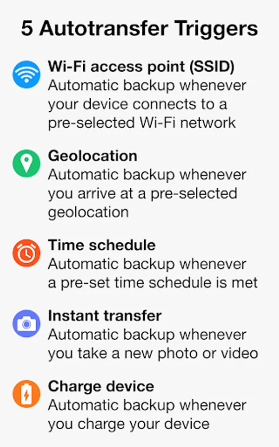 • Five configurable Autotransfer triggers: Wi-Fi access point (SSID), geolocation, time schedule, take a photo and charge device
