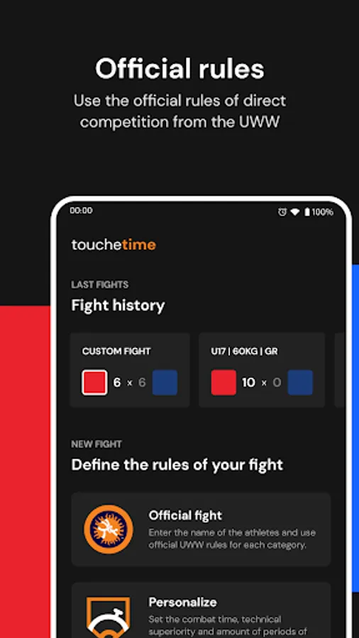 With incredible customization possibilities ranging from rounds to the time of each fight, you have a powerful way in your hands to manage fights, training, competitions and evolve with your entire team in this global sport. You can choose age, weight and style category by applying all official wrestling rules according to the UWW.