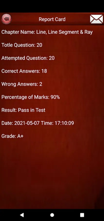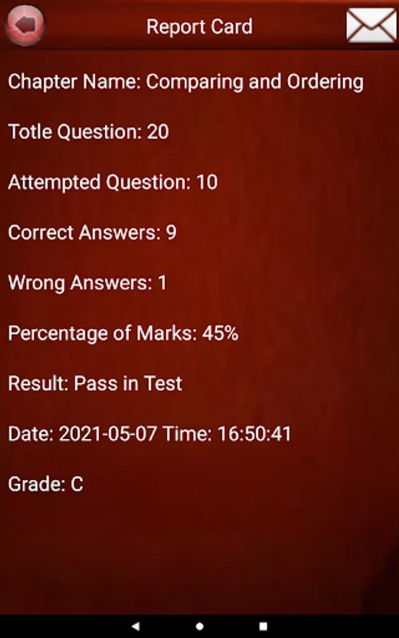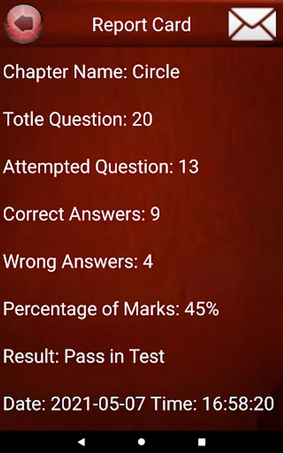 * Report Card: - After playing quizzes you can see your performance report card based on the grading system and also can mail your performance report to your teachers, parents, and friends.