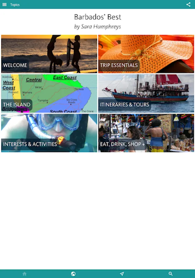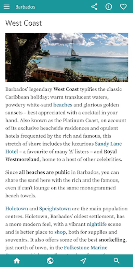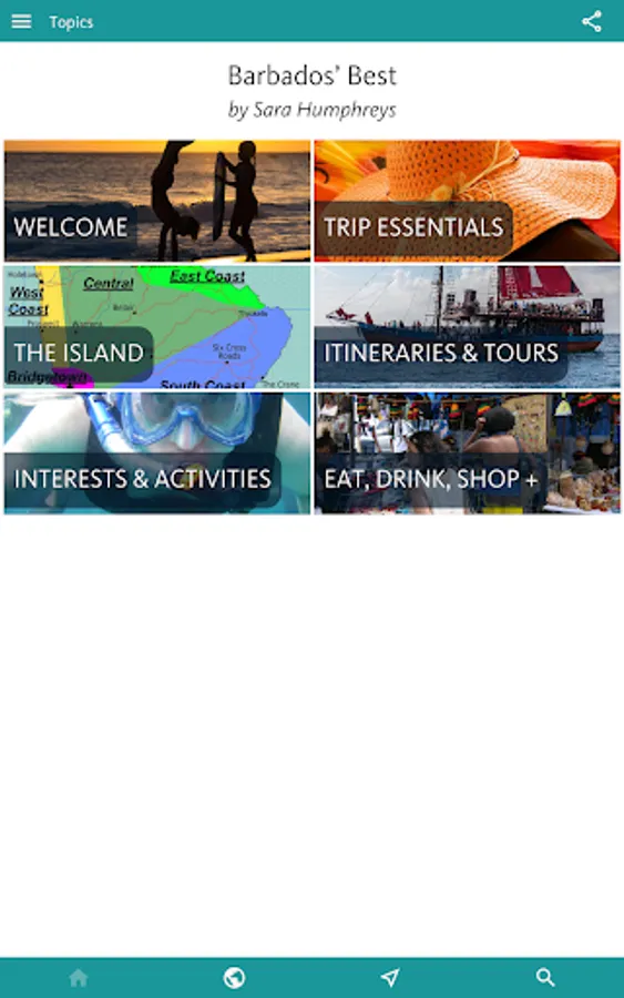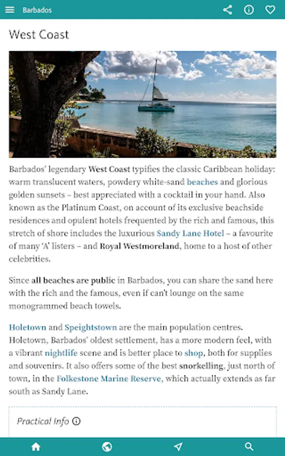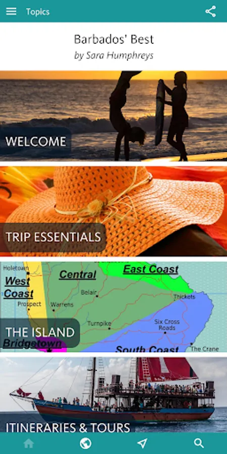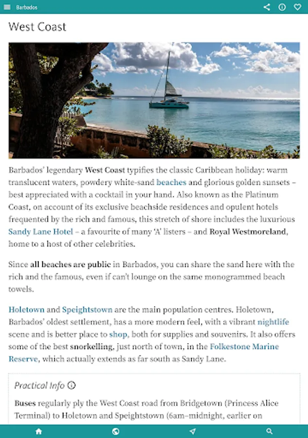 You’ll find all you need to enjoy the best of the island by theme in the next, INTERESTS & ACTIVITIES, section of the app. Here you’ll find an overview of interests as diverse as finding the best BEACHES; the finest places to sample RUM; an inventory of the WATER SPORTS (catamarans, sailing, diving, snorkelling, SUP, kayaking, surfing); and a thorough section on Barbadian HISTORY.