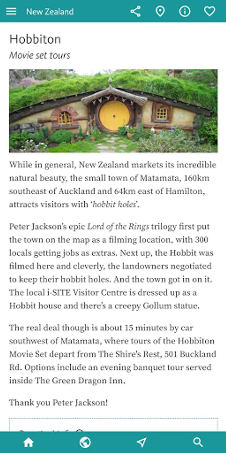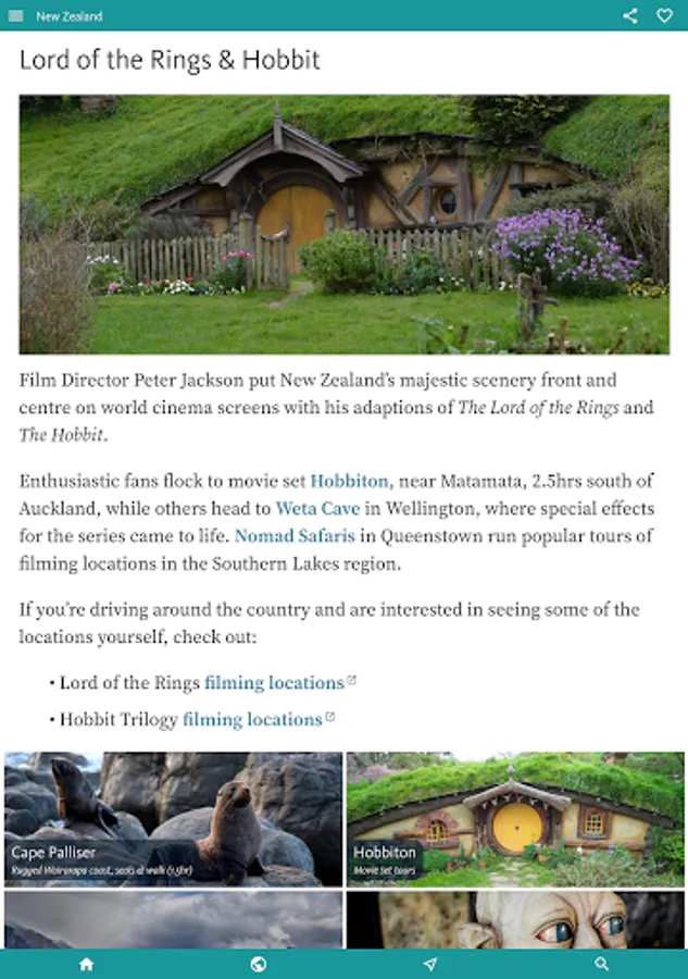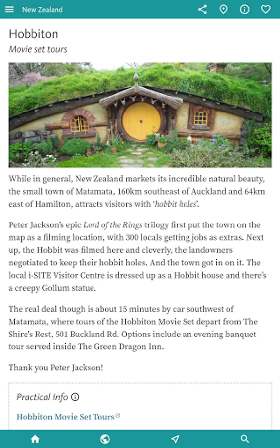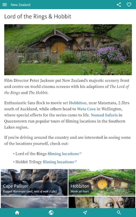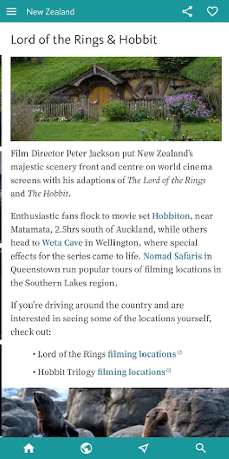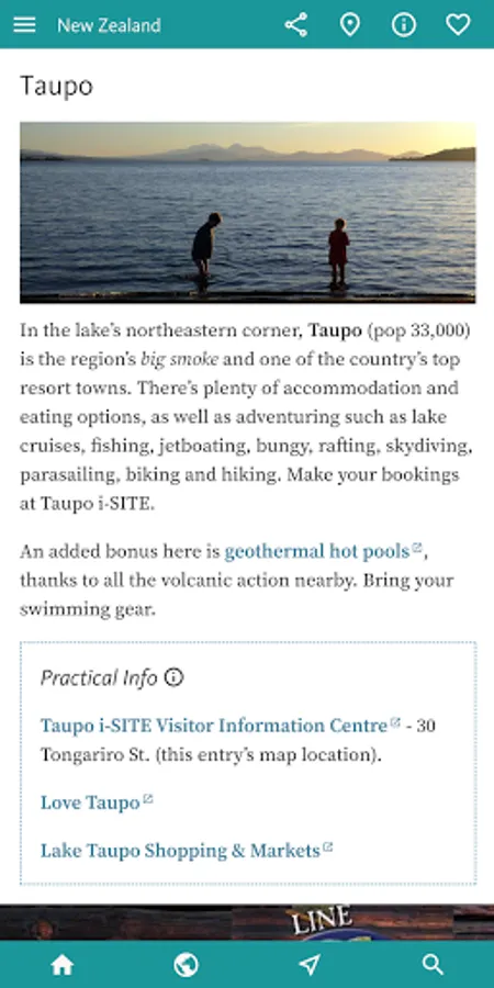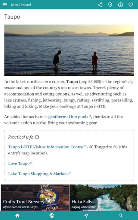There’s much more on these two in the INTERESTS & ACTIVITIES, the next section of the app, that’s designed to give you the heads-up based on your interests. If you’re travelling with KIDS or heading to NZ for WINTER SPORTS then you might just dive straight into the app here. Other categories here include ART & CULTURE, BEACHES, CYCLING, HISTORY, LORD OF THE RINGS, NATIONAL PARKS and OUTDOOR ADVENTURE – which covers the many odd ball outdoor activities Kiwi’s specialise in, from bungy jumping through rafting to zorbing.