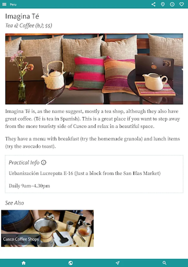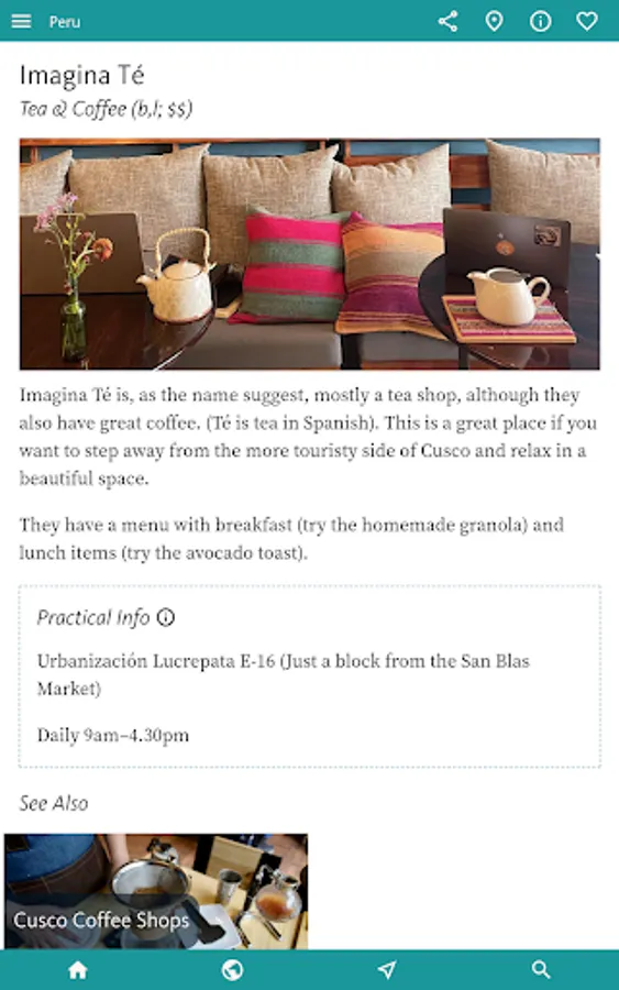 Finally, the app details a handpicked selection of RESTAURANTS & CAFES, many located near key sights. There’s also a little on SHOPS & SHOPPING with special emphasis on the many exceptional MARKETS.