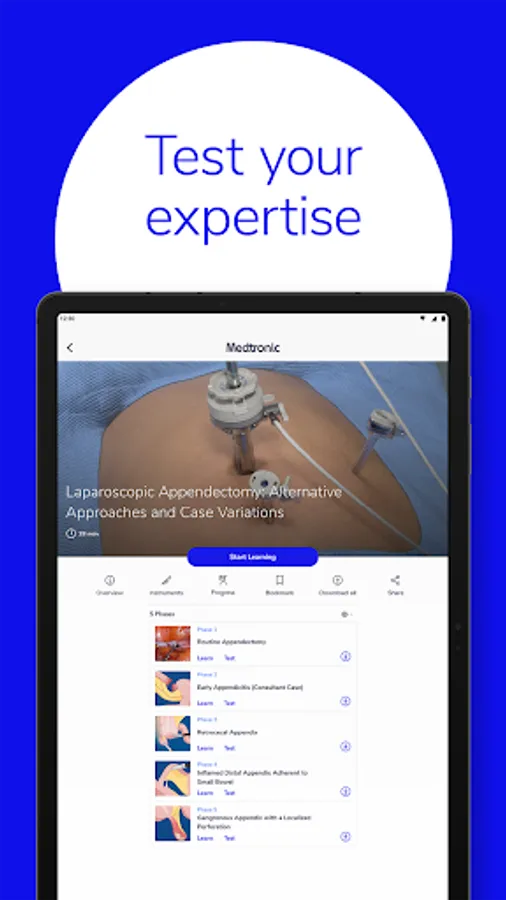 Physicians, nurses and healthcare professionals can train and test their knowledge of surgery with clear and informative content at every step of a procedure. They can master specific exercises or freshen up on their skills before an operation.