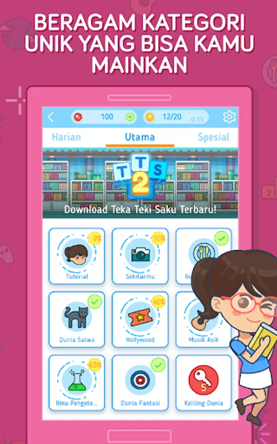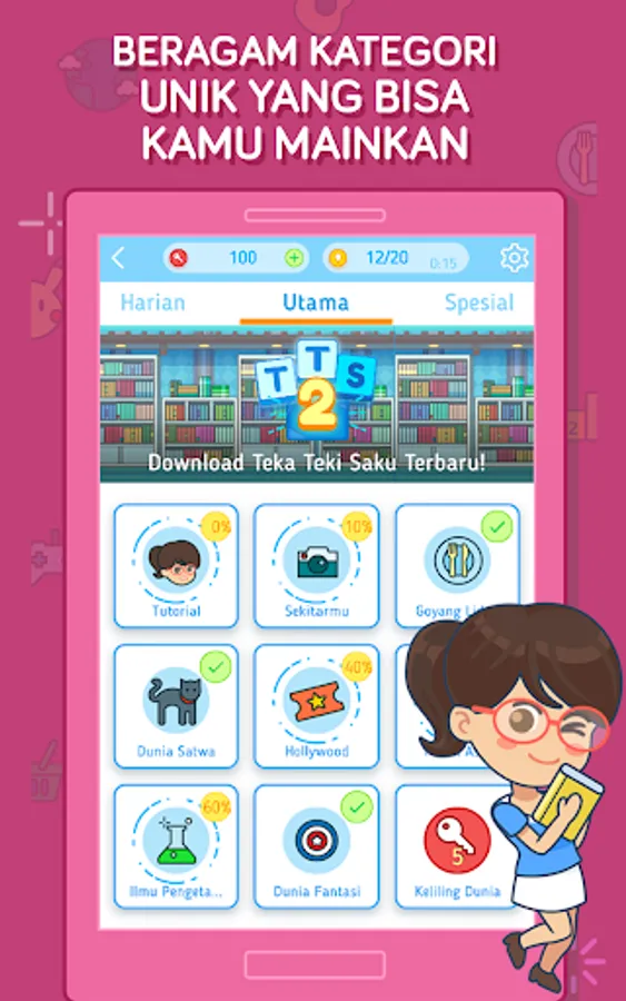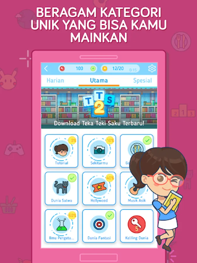 Masih ingat dengan kuis survey family 100? Kini kamu dapat memainkan di TTS 2 bersama keluarga dan kerabat. TTS 2 adalah permainan teka teki silang atau Crossword yang dikemas lebih menarik khusus untuk anak anak hingga dewasa yang dapat kamu mainkan dimanapun dan kapanpun. Kamu akan di minta untuk membantu Tini menemukan kata tersembunyi dari nama makanan, film, musik, hewan, dan lain lain. Jadilah raja kuis dalam permainan ini dan dapatkan hadiah hadiah menarik dari KadoSaku